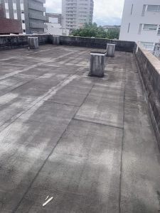 宮崎県の屋根外壁塗装、防水工事はベストペイントにお任せ下さい 都城市防水工事の施工例です サラセーヌ通気緩衝工法 【施工前】 【施工中】 【施工中】
