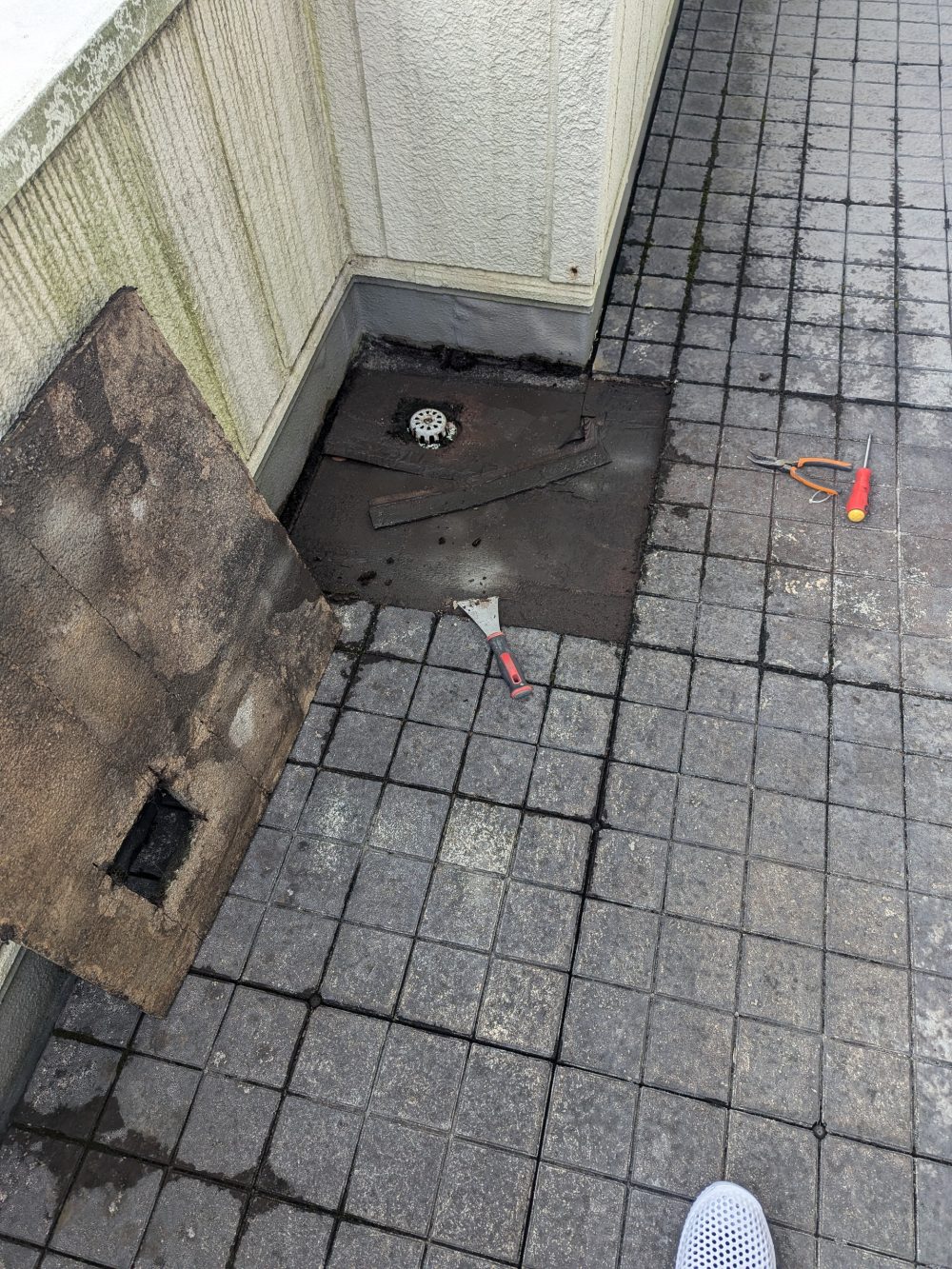 それらを全て一時撤去し、防水層全面露出してからやっと防水工事が始まる、という訳です。